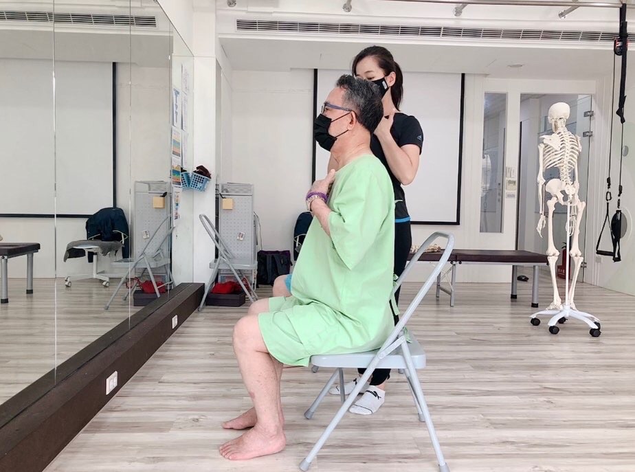 利用foundation training的技巧,藉由深呼吸擴張肋骨,帶動胸腔的正位、肩胛的穩定、頸椎的延伸,去減低關節的壓迫、筋膜的沾黏,持續練習後,不適感飛走了,做什麼都開心